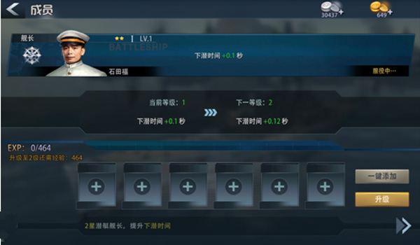 5、潛艇:強(qiáng)在隱匿和多魚雷,弱在機(jī)動(dòng),如果想要進(jìn)一步提升隱匿能力和魚雷,可以對成員中的“艦長”“火炮手”來選擇提升,如果想要彌補(bǔ)短板,那么可以對成員中的“輪機(jī)長”來進(jìn)行提升,如果想要進(jìn)一步提升輔助探測,可以對“通訊員”來進(jìn)行提升。
