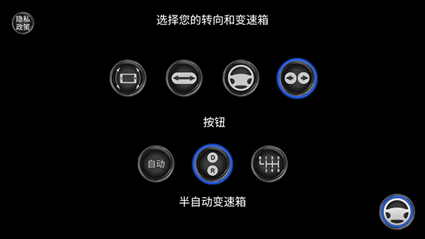 2、開(kāi)始游戲前會(huì)有一個(gè)調(diào)整駕駛模式的選項(xiàng),第一行可以選擇陀螺儀控制轉(zhuǎn)向、方向盤(pán)控制轉(zhuǎn)向和按鍵控制轉(zhuǎn)向,下方可以選擇自動(dòng)掛單、半自動(dòng)掛擋和全手動(dòng)掛擋,這邊推薦新手玩家選擇按鍵轉(zhuǎn)向和半自動(dòng)掛擋。