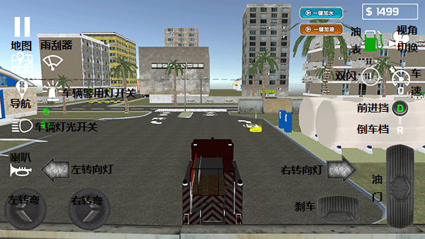 3、進(jìn)入模擬任務(wù)駕駛頁(yè)面,左邊從上到下依次是地圖選項(xiàng)、雨刮器關(guān)閉打開(kāi)選項(xiàng)、GPS任務(wù)定位選項(xiàng)、消防車(chē)警用燈選項(xiàng)、車(chē)輛遠(yuǎn)光近光燈選項(xiàng)、車(chē)輛喇叭、左轉(zhuǎn)向燈以及左轉(zhuǎn)彎和右轉(zhuǎn)彎選項(xiàng);右邊從上到下依次是車(chē)輛油量顯示、視角切換、車(chē)輛雙閃、車(chē)速表、前進(jìn)后退掛擋、車(chē)輛油門(mén)、右轉(zhuǎn)向燈和剎車(chē)。