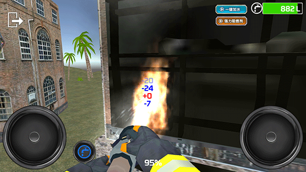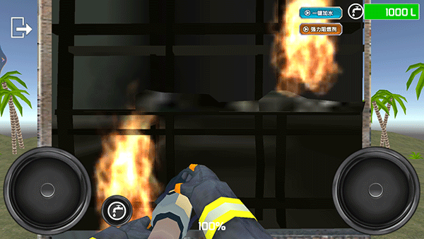 6、進(jìn)入滅火模式后,左邊輪盤(pán)控制消防員移動(dòng)位置,右邊輪盤(pán)控制消防員手上的高壓水槍?zhuān)瑢?duì)準(zhǔn)著火點(diǎn),點(diǎn)擊左邊輪盤(pán)旁邊的水龍頭可以打開(kāi)/關(guān)閉高壓水槍。