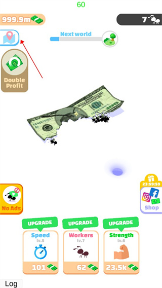 1、首先大家進(jìn)入小蟻帝國(guó)游戲,可以看到螞蟻需要搬運(yùn)的物品,也可能是食物,這次小編的是鈔票。