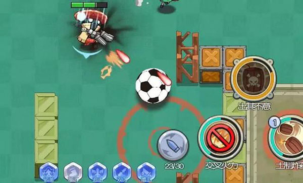 在踢球過(guò)程中,因?yàn)殡p方都會(huì)為了將球踢進(jìn)對(duì)方球門而去接近足球,而荒漠槍手可以將炸藥放在敵方踢球的必經(jīng)之路上,會(huì)使對(duì)面在踢球被眩暈與不踢之間選擇。