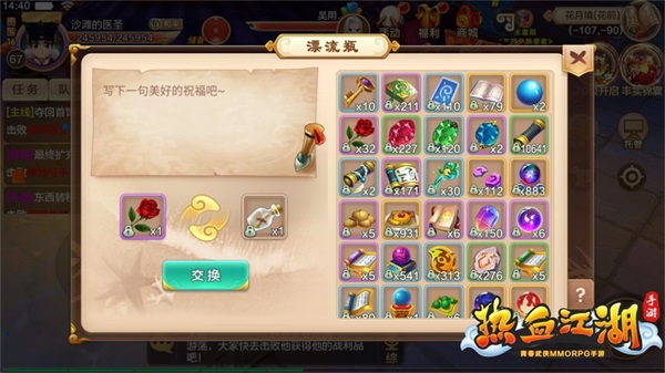 首先最推薦各位俠士接取的任務(wù),就是江湖中的“開盲盒”任務(wù)——漂流瓶。這個(gè)任務(wù)不用跑圖買東西和找人,也不用打打殺殺,而是非常娛樂的“互開盲盒”。把你的驚喜道具塞進(jìn)漂流瓶并丟向大海,同時(shí)會(huì)收獲一個(gè)漂流瓶,收獲的這個(gè)漂流瓶中有其他玩家給的什么驚喜呢,就要看你的人品怎么樣啦~不過不管收獲道具的好壞,都能有很龐大的經(jīng)驗(yàn)獎(jiǎng)勵(lì)喔~