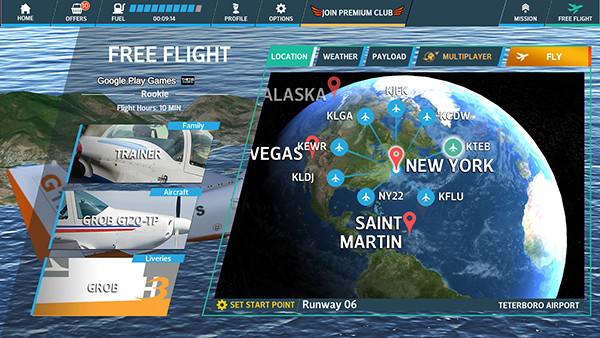 1、下載安裝后進(jìn)入游戲,點(diǎn)擊右上角“FREE FLIGHT”下方fly開始游戲。