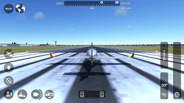 2、進(jìn)入游戲后,拉動右下角長條風(fēng)扇啟動飛機(jī),左邊控制起飛角度,起飛角度調(diào)整到30°就可以起飛了。