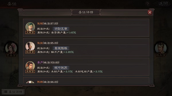 【黑板備注】有的官員我推薦使用滿紅的三星或者四星的將,加點(diǎn)全點(diǎn)政治或者魅力(按所需屬性來(lái))。