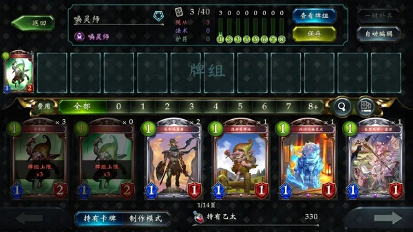 分為牌組編輯與卡牌一覽/生成。牌組編輯可以對(duì)自己的全部卡牌進(jìn)行編組處理,每組40張,有指定系列和無(wú)限制兩種類型。卡牌一覽/生成,則是對(duì)全部卡牌的瀏覽以及卡牌的制作。