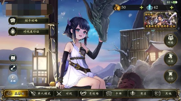 頁(yè)面下方是游戲中全部界面的菜單選項(xiàng),有單人模式、對(duì)戰(zhàn)、競(jìng)技場(chǎng)、卡牌、商店和其他,頁(yè)面右側(cè)菜單為公告、郵箱、任務(wù)、好友以及直播。