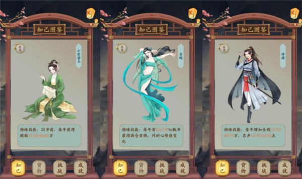 2、除了這三位開局知己,這里再推薦幾個非常強的知己作為前中期選擇對象,分別是小家碧玉、青蛇、神捕。想要迎娶小家碧玉需要家里僅有一個產業(yè),對于前期來說一年幾十萬的額外收入非常關鍵。