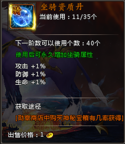 (1)坐騎可以喂食成長丹,成長丹可以固定值增加坐騎的進(jìn)階屬性;
