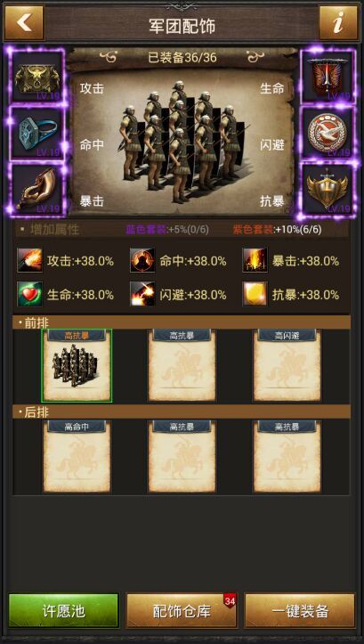 配飾可以吞噬其它無(wú)用配飾和配飾經(jīng)驗(yàn)卡進(jìn)行升級(jí),配飾升級(jí)可以大幅度提升兵種屬性,玩家可以查看當(dāng)前配飾對(duì)各個(gè)兵種的屬性加成。
