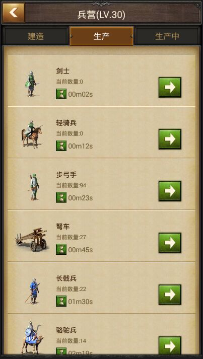 在城池建筑點(diǎn)擊軍營(yíng),可以進(jìn)入士兵生產(chǎn)和治療界面,選擇合適的兵種類型進(jìn)行生產(chǎn)或治療。