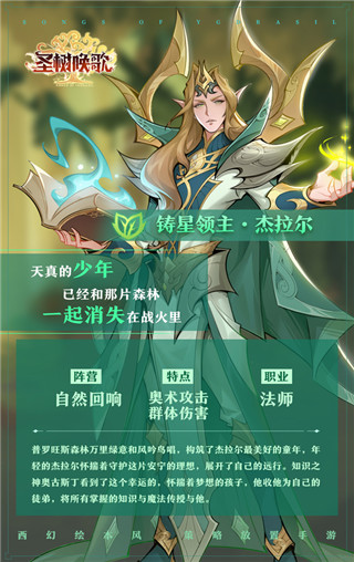天資過人的精靈少年沒有讓自己的師傅失望,他早早得掌握了魔法的奧秘,并且非常善于運(yùn)用自然的力量。奧古斯丁和杰拉爾兩人亦師亦友,一起度過了一段快樂而平靜的歲月。戰(zhàn)爭(zhēng)的利刃始終劃破了這幅溫馨的畫卷,墜星之城的炮火轟襲著自然之森,杰拉爾不得不含淚告別自己的恩師,回去保護(hù)自己的故鄉(xiāng)。\n##當(dāng)他看到綠草如茵的故鄉(xiāng)成為一片焦土?xí)r,杰拉爾無法掩埋心中的憤怒,他發(fā)誓讓入侵者們付出代價(jià),不過杰拉爾總是壓制住自己的敵人,并不會(huì)痛下殺手。在漫長(zhǎng)的戰(zhàn)爭(zhēng)中,杰拉爾加入了風(fēng)暴女皇艾琳的軍隊(duì)??吹剿牡谝谎?,杰拉爾便被這位美麗而驕傲的女皇所吸引,而杰拉爾神奇的魔法才華和善良,也得到了艾琳的關(guān)注。兩人在戰(zhàn)斗中逐漸相識(shí)相知,相扶相戀,率領(lǐng)自然回響陣營(yíng)吹起了反擊的號(hào)角,漸漸扭轉(zhuǎn)了劣勢(shì)。