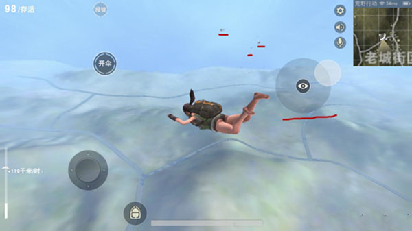 小地圖顯示區(qū)域,點擊小地圖可以查看放大版的小地圖。 右上角為“設(shè)置”,點擊可以呼出設(shè)置界面,進行操作模式的選擇等。 右下角為“奔跑”,點擊進入奔跑狀態(tài),但新的移動,射擊,下蹲等操作會打斷這個奔跑狀態(tài)。 奔跑狀態(tài)用于玩家需要長距離奔跑時,便有玩家操作。 11、虛擬搖桿-人物移動