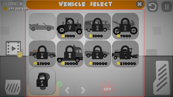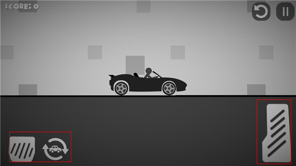 3、活用按鈕,左邊的按鈕是讓車減速或者后退的,右邊長條的按鈕是加速前進的,而有汽車標志的是讓車重新從空中落下的,反復使用這三個按鈕可以讓火柴人受傷更多: