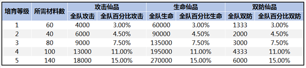 下面是從策劃處拿到的培育屬性表,想省事的各位魂師可以直接保存哦。表中可以看到,SS仙品的培育屬性都是全隊(duì)屬性。如果穿戴一套培育到SS級(jí)的仙品,上陣的所有魂師都可以享受15%屬性增幅。而且全隊(duì)屬性會(huì)在SS仙品培育完成時(shí)生效,無(wú)論是否裝備。