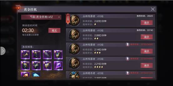 1、根據(jù)角色當(dāng)前的防御值,選擇系統(tǒng)推薦的掛機(jī)點(diǎn),不僅可以獲得更多的經(jīng)驗(yàn),還有機(jī)會(huì)掉落當(dāng)前等級(jí)最適合的裝備和其他稀有道具。