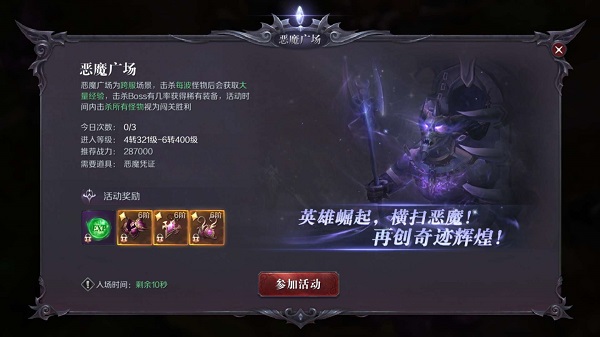 惡魔廣場(chǎng)為跨服活動(dòng),參與可獲得大量經(jīng)驗(yàn),擊殺BOSS有幾率獲得稀有裝備,是每天必做的日常之一。