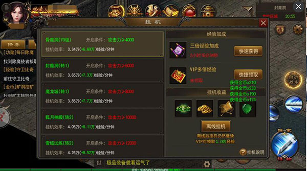 相當于離線經(jīng)驗,這個設(shè)置對于平時工作或者事情比較忙,無法使用手機長在線的玩家比較友好,一樣有經(jīng)驗和內(nèi)功經(jīng)驗,材料獲得,相當人性化。