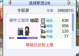 3、因為員工是可以轉職的,編程、劇本、美術、音樂這4個是基礎職業(yè),可以隨時互相轉換,“總監(jiān)”和“制作人”是二級的,也就是前面4個基礎職業(yè)其中3個達到5級后才會出現這兩個。“硬件工程師”是三級的,就是說前面的編程、劇本、美術、音樂、總監(jiān)”和“制作人”全達到5級才可以出現,“黑客”是最高級職業(yè),其它職業(yè)全5級才能轉黑客。