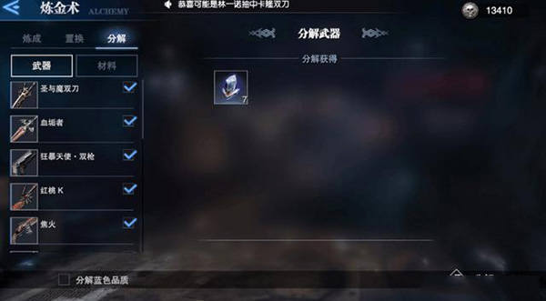 抽到重復(fù)的武器自動(dòng)分解,不需要的武器可以在煉金術(shù)中進(jìn)行分解。