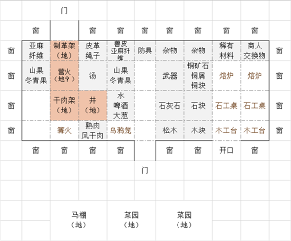 20箱子、1篝火、2菜園(地)、1烏鴉籠