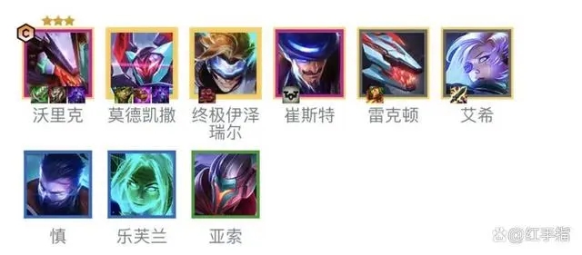 陣容組成:艾希、雷克頓、亞索、樂芙蘭、慎、崔斯特、沃里克、莫德凱撒、終極伊澤瑞爾