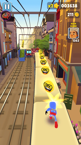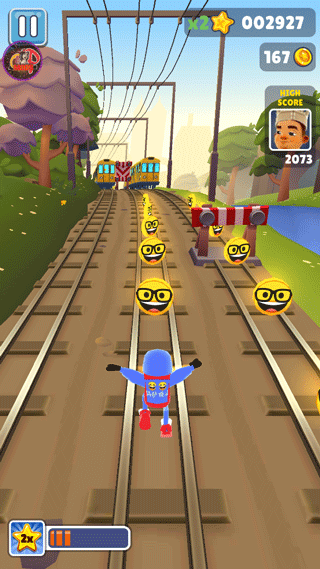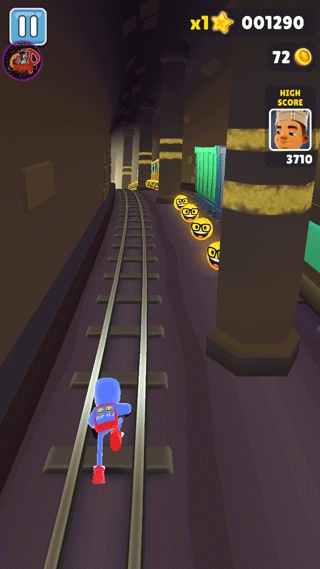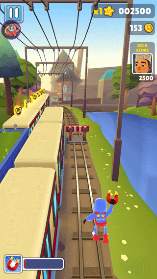 玩家經(jīng)常遇到的一種情況。左右兩路沒有任何障礙,中路有5~6輛火車奔過來。為了能夠把車上的金幣吸收干凈,這個時候就可以運用基礎(chǔ)組合跳滾了,前提是不要玩得太很,穩(wěn)一些較好,如果火車還沒到達(dá)玩家下方,玩家就已經(jīng)在半空中往下劃那么就只有死翹翹了。