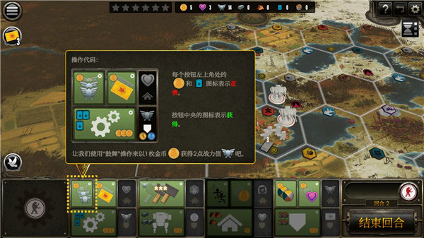 4、游戲的規(guī)則和流程相當簡單,每回合玩家們輪流選擇行動面板上的4個行動區(qū)域之一(不可與上一回合行動相同),執(zhí)行頂部行動與底部行動。所有的行動圖標都簡潔明了,紅色圖標為花費,綠色圖標為收益。