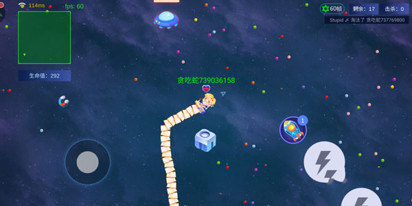 在地圖中還會遇到其他玩家的小蛇,頭部撞到其他小蛇也會導(dǎo)致死亡。要消滅敵蛇需要用身體去撞擊,消滅后可吃下敵蛇的豆子來增加自身的長度。