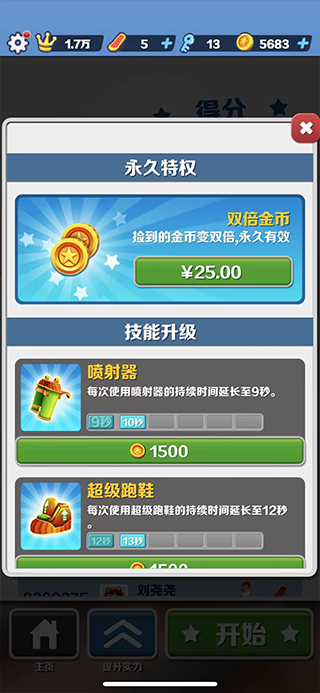 30(基礎(chǔ)噴射)+7(開局加分點(diǎn)滿)+10(滿級(jí)洛奇機(jī)械手表)+10(永久十倍得分道具)+5(人物與滑板)=62×2(游戲中撿到雙倍)=124