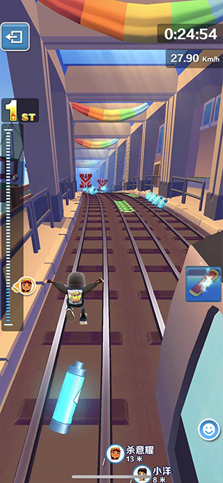 在游戲有活動(dòng)的時(shí)候經(jīng)常會(huì)出現(xiàn)收集品出現(xiàn)在高高的屋頂上,要保證屋頂附近有落腳點(diǎn),也就是火車,這樣玩家才可以借著火車向上跳到屋頂。有個(gè)小小的技巧需要告訴大家,在跳的時(shí)候人物不論在左右還是中央都是可以進(jìn)去的哦,用跳鞋的話很順暢,但不要玩死,無跳鞋也可以放心大膽地上去,只會(huì)小絆一下并不礙事。