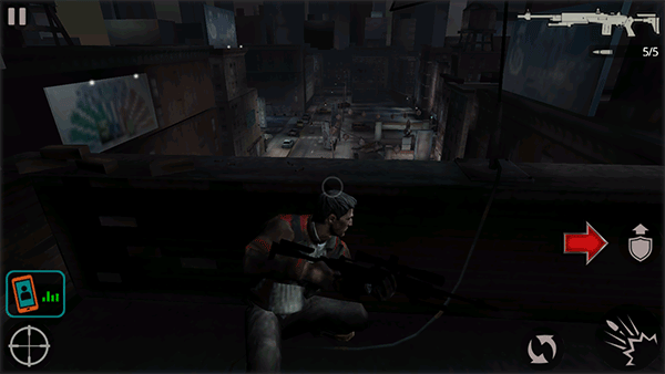 1、下載安裝好殺手2影子陰謀手機(jī)版,游戲開始我們將身處天臺上,并在一個(gè)掩護(hù)的狀態(tài)。點(diǎn)擊右側(cè)的盾牌箭頭圖標(biāo),主角將站起離開掩護(hù)。