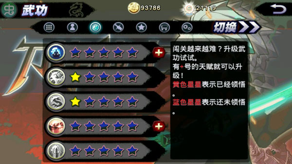 1、武功這里的武功即代表著角色的技能,該游戲武功類型多樣,并且多數(shù)都有全屏效果。若感覺闖關(guān)變得越來越難,不妨升級(jí)一下武功。如圖下所示,有紅色加號(hào)的代表可以學(xué)習(xí)本功夫,黃色星星代表著已經(jīng)領(lǐng)悟,藍(lán)色星星代表還未領(lǐng)悟。
