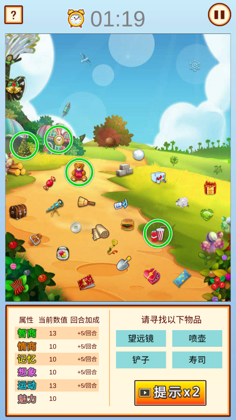 3、點(diǎn)擊尋找到右下角顯示的物品即可過關(guān)提高智商、情商、記憶、想像、運(yùn)動和魅力的回合加成。