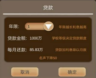 3、貸款會降低名聲,金額由學校當前的等級決定,年限越久利息也就越高,玩家們需要根據(jù)個人情況來合理的選擇時間。