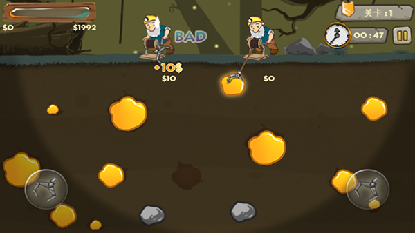 4、操作簡單,在鉤子搖擺的過程中,瞄準金子,點擊屏幕時即會釋出鉤去抓取金子。