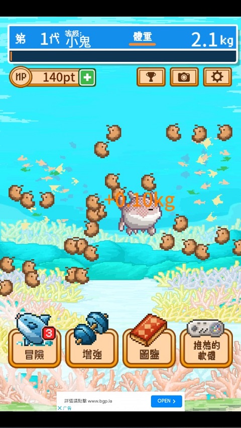 活下去曼波魚(Mola mola)是一款十分有趣的游戲,該游戲采用了十分經(jīng)典的像素游戲風(fēng)格,并且玩法也是十分經(jīng)典,延續(xù)“大魚吃小魚”的傳統(tǒng)玩法,通過進食,實現(xiàn)瘋狂的進化!該游戲操作簡單,玩法有趣,點擊屏幕上出現(xiàn)的小水母、浮游生物即可增加體重!游戲中每一段時間,就能夠刷新食物,隨著游戲不斷發(fā)展,不斷的進化,就能夠輕松的解鎖新任務(wù),開啟新的冒險。游戲中擁有多種游戲結(jié)局,玩家可以進行隨意探索!該游戲還提供的豐富的圖鑒功能,讓玩家能夠擁有收集感。感興趣的朋友不妨下載嘗試一番吧!