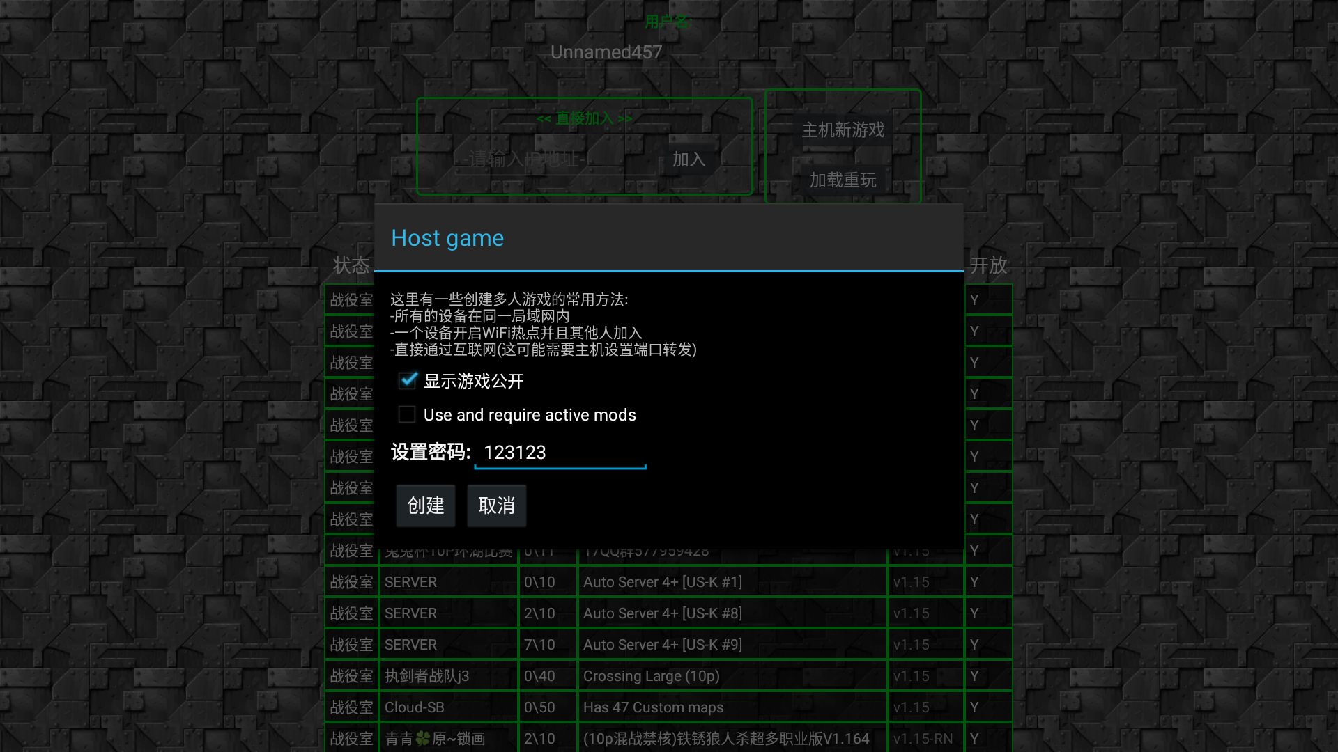 3、設(shè)置好密碼,通過(guò)上面給出的聯(lián)機(jī)方式實(shí)現(xiàn)多人聯(lián)機(jī),點(diǎn)擊創(chuàng)建。