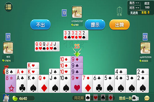 4)接風:如果說場上某一名玩家的最后一手牌出手之后,剩余的玩家全都接不住,那么下一輪游戲的出牌權就會交由他的對家,也就是他的隊友玩家。
