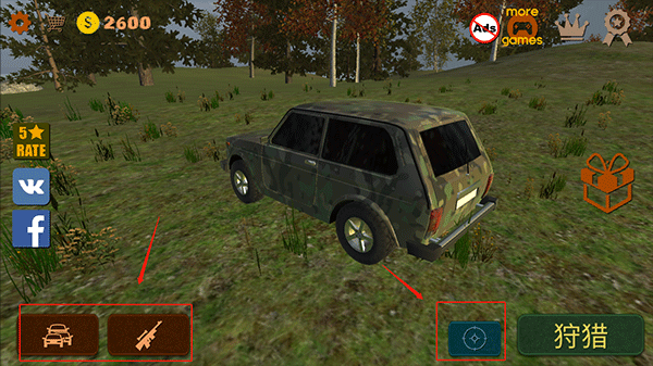 1、打開狩獵模擬器游戲后你可以在游戲首界面中選擇你的汽車和武器,右邊靶信圖案為任務(wù)