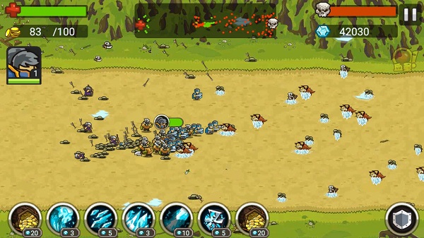 玩家進入關(guān)卡前先選擇要派出的英雄,士兵和可使用的技能;在關(guān)卡會自動增長金幣,消耗金幣選擇我們要召喚的士兵,用鉆石可以釋放技能幫助我們擊殺大量的敵人,把對方的大本營毀滅或者擊殺關(guān)卡BOSS即可獲得通關(guān)。