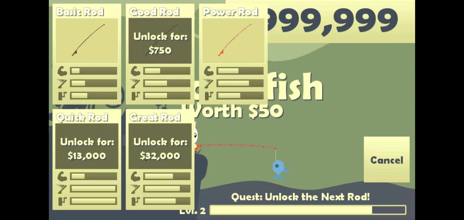 4、獲得一定的金幣后,你可以購買漁具,點(diǎn)擊左上角的【漁具】按鈕即可,這樣你的魚鉤能拋到更遠(yuǎn)的地方,釣到更多的魚。