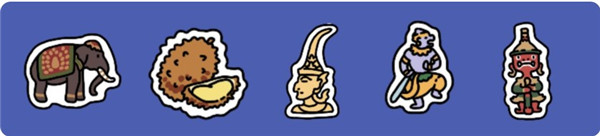 泰國象(黑色)、榴蓮、尖帽子人像(很眼熟,但實在沒找到是什么東西)、舞刀的藍色膚色的人、泰國木偶