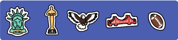 自由女神頭像、小金人、鷹、金門大橋、橄欖球