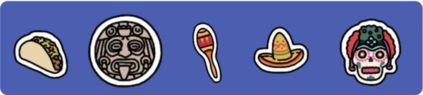 墨西哥卷餅、太陽歷石(墨西哥國寶)、沙錘(樂器)、墨西哥草帽、墨西哥亡靈節(jié)骷髏