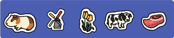 荷蘭豬(團鼠)、風(fēng)車、郁金香、奶牛、荷蘭木鞋