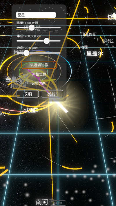 4、位置方向確定好后,然后可以調(diào)整球體的大小、自轉(zhuǎn)速度以及質(zhì)量等,參數(shù)設(shè)置完畢后點(diǎn)擊發(fā)射即可。