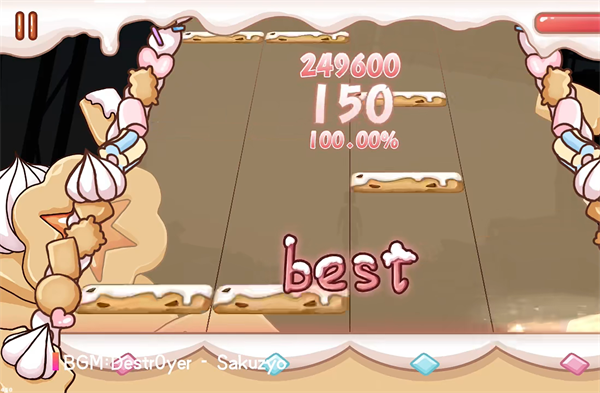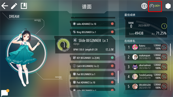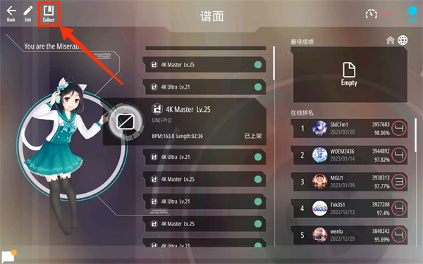7、下面是打歌界面,中間是譜面的選擇,右邊是排行榜以及玩家的最佳成績(jī)